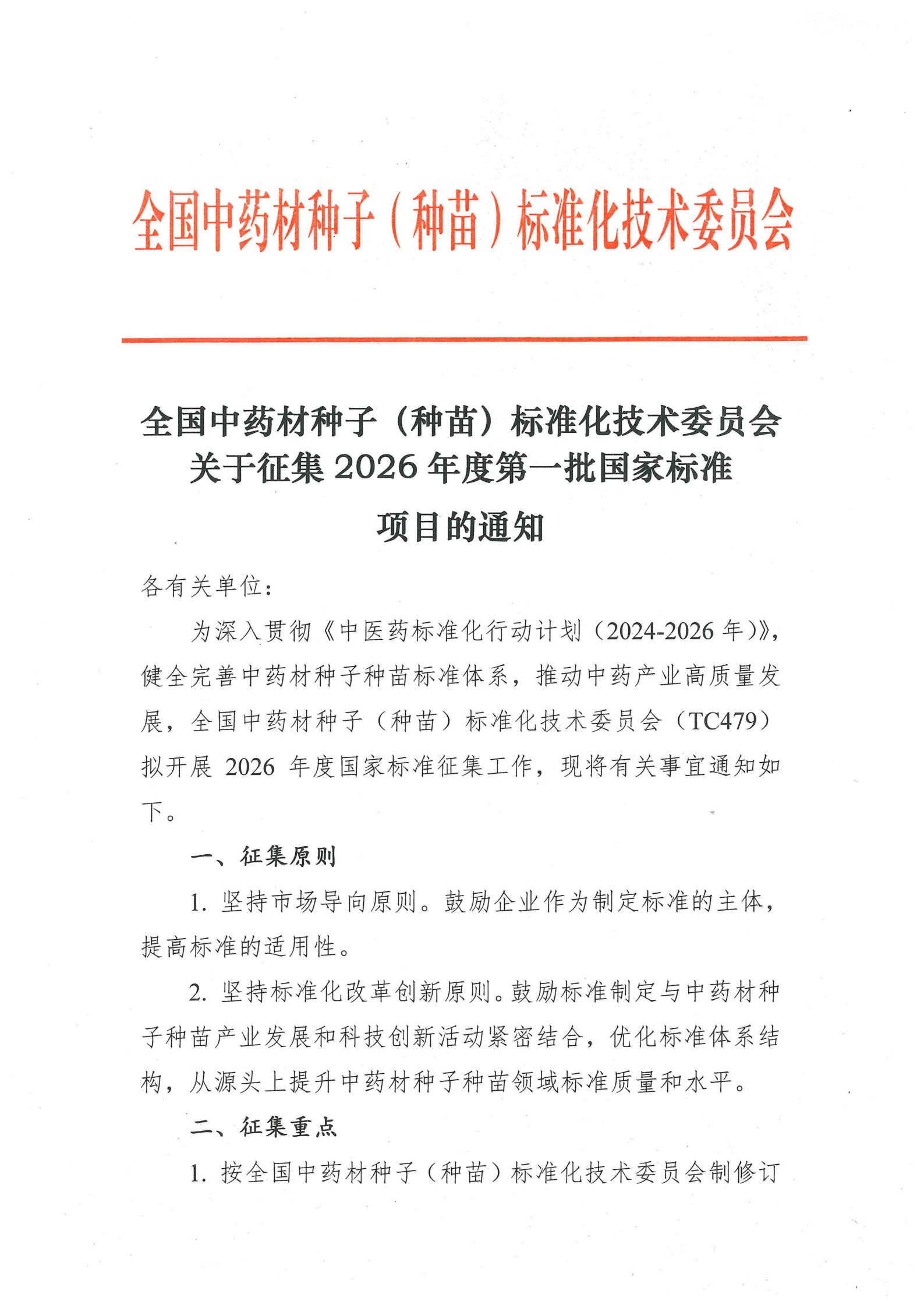 全国中药材种子(种苗)标准化技术委员会关于征集2026年度第一批国家标准项目的通知