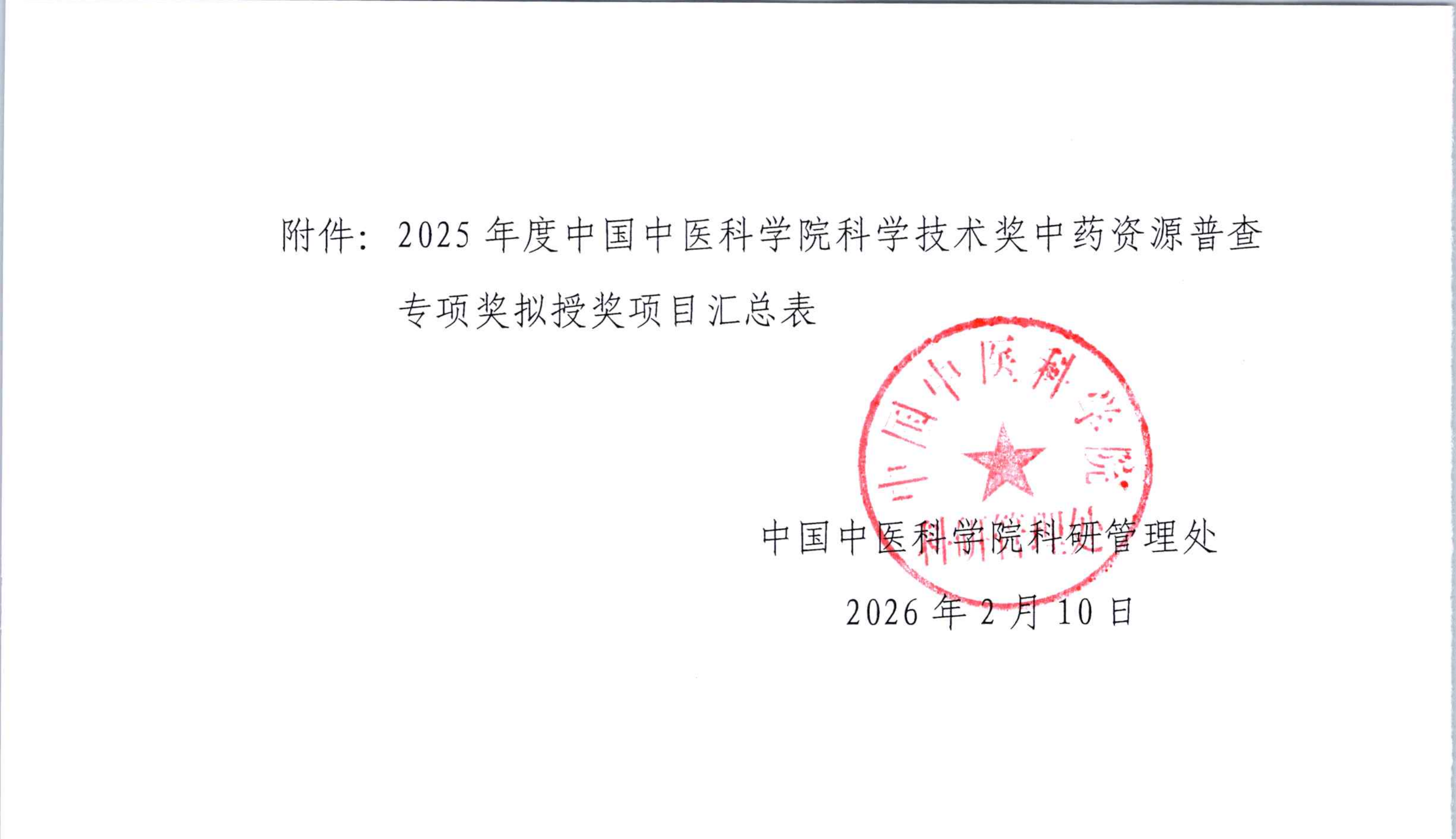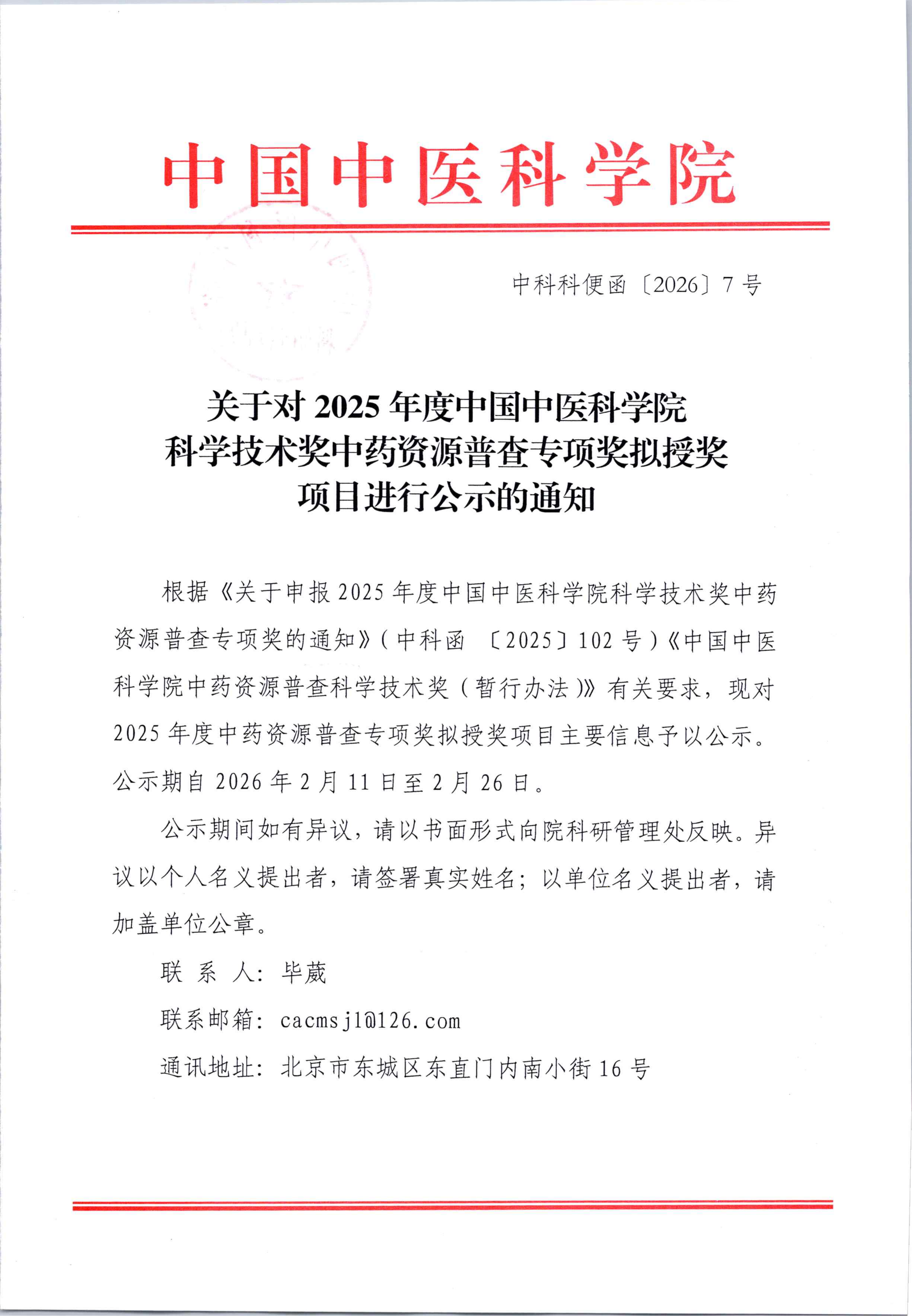 关于对2025年度中国中医科学院科学技术奖中药资源普查专项奖拟授奖项目进行公示的通知