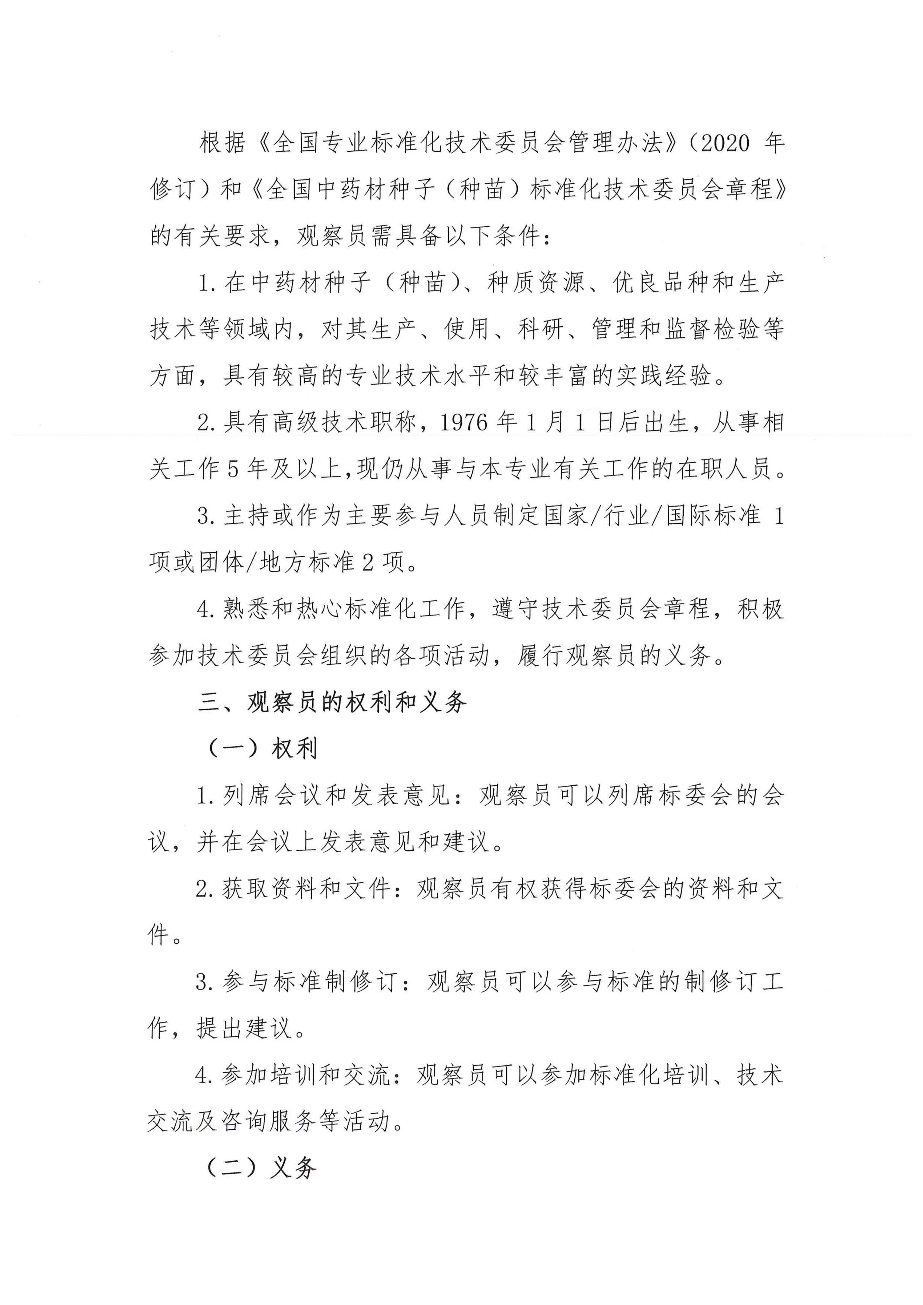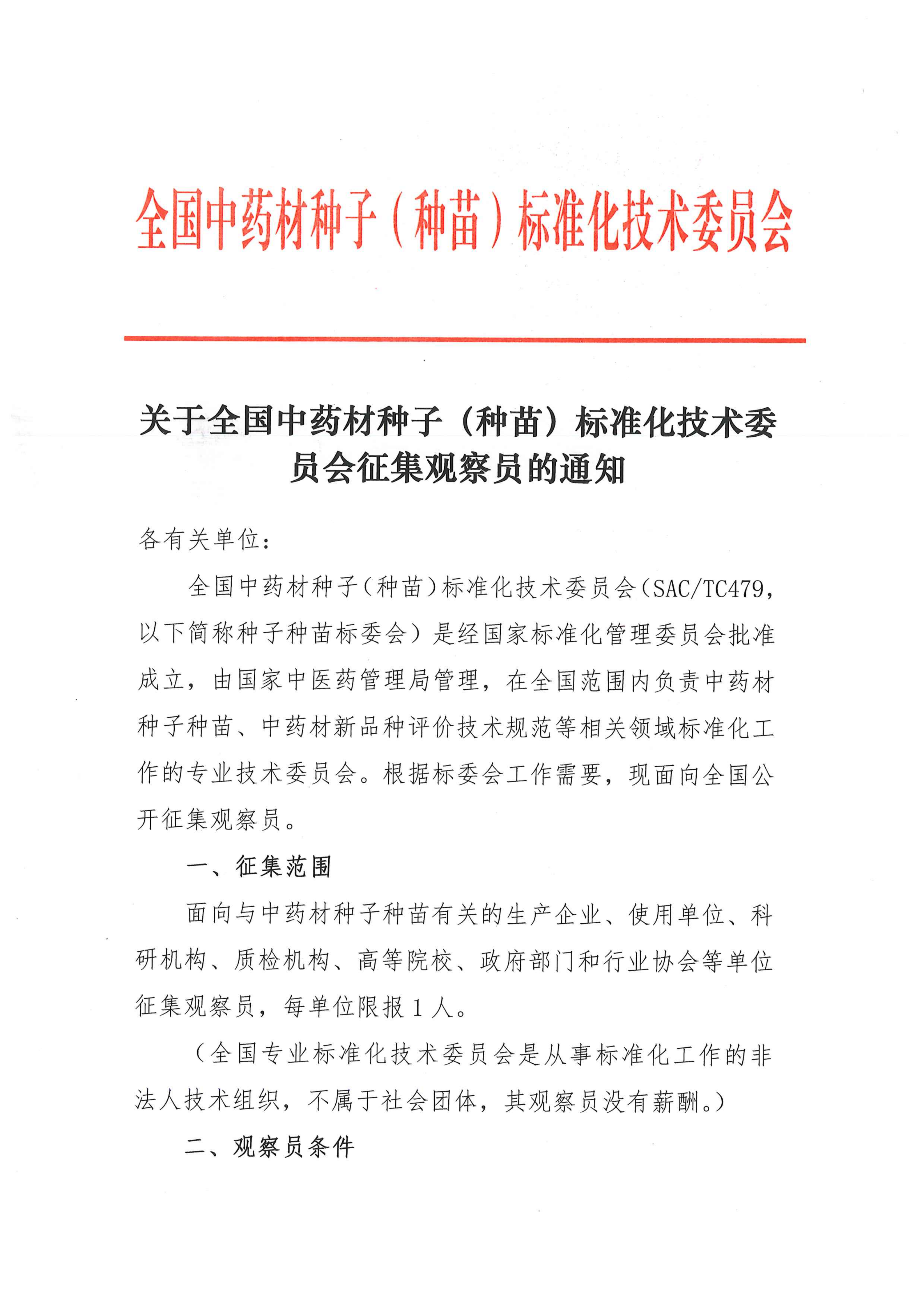 关于全国中药材种子(种苗)标准化技术委员会征集观察员的通知