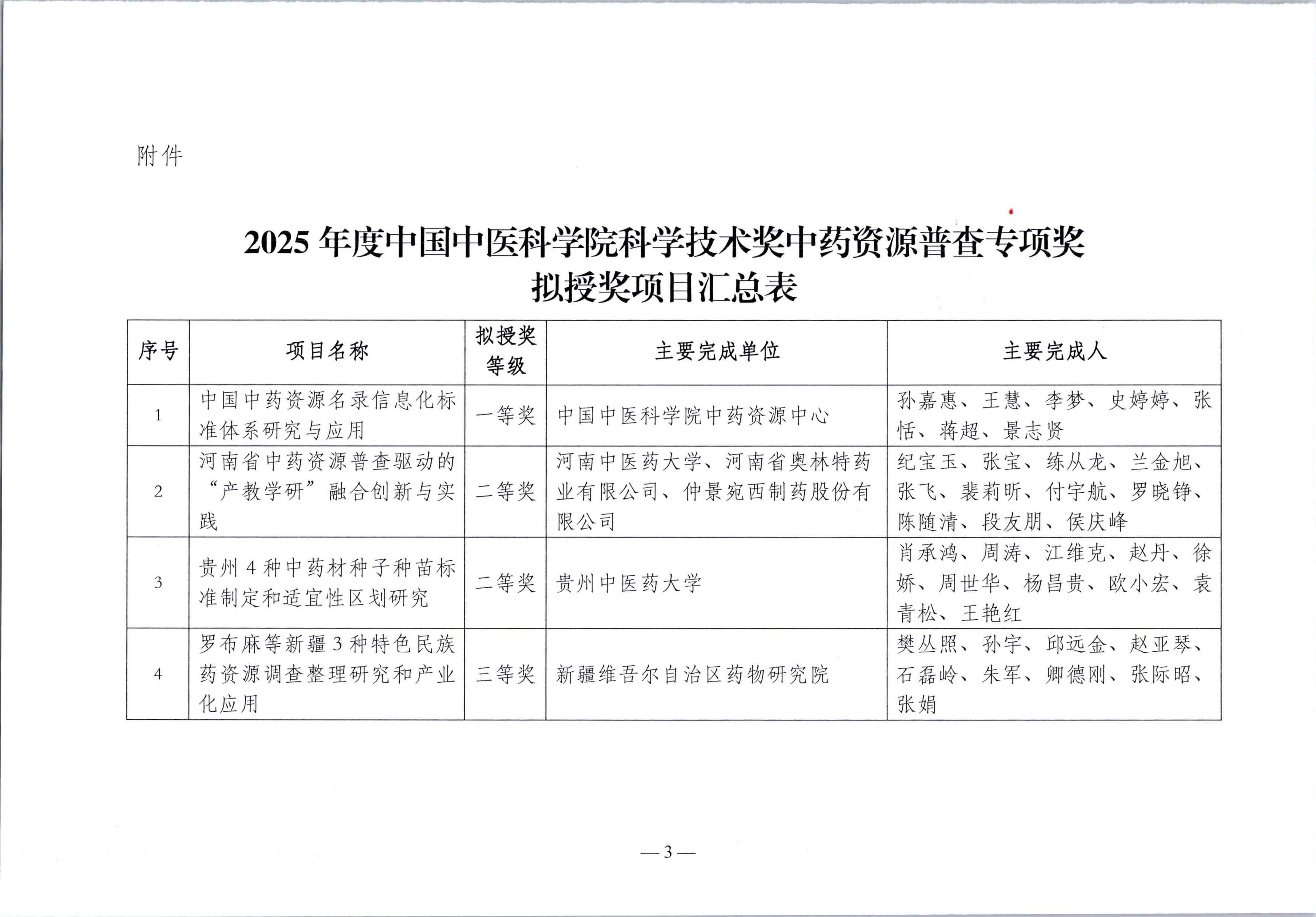 关于对2025年度中国中医科学院科学技术奖中药资源普查专项奖拟授奖项目进行公示的通知